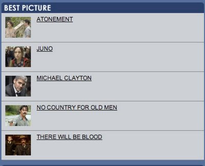 Tendo visto mais de 50% dos indicados a melhor filme - Desejo e Reparação, Onde os Fracos não têm Vez e Juno - eu posso dizer que TIENGO PAURA!!!